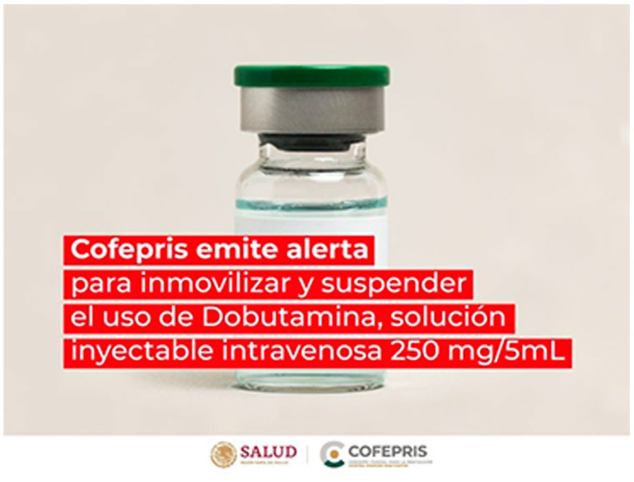 Comunicado. La Cofepris emitió una alerta sanitaria a profesionales de la salud y al sector salud para inmovilizar y suspender, de manera preventiva, el uso y administración de dobutamina, solución inyectable intravenosa 250 mg/5 mL con cualquier número de lote, distribuida por Biosistemas y Seguridad Privada, S.A. de C.V. y fabricado por Health Biotech Limited.