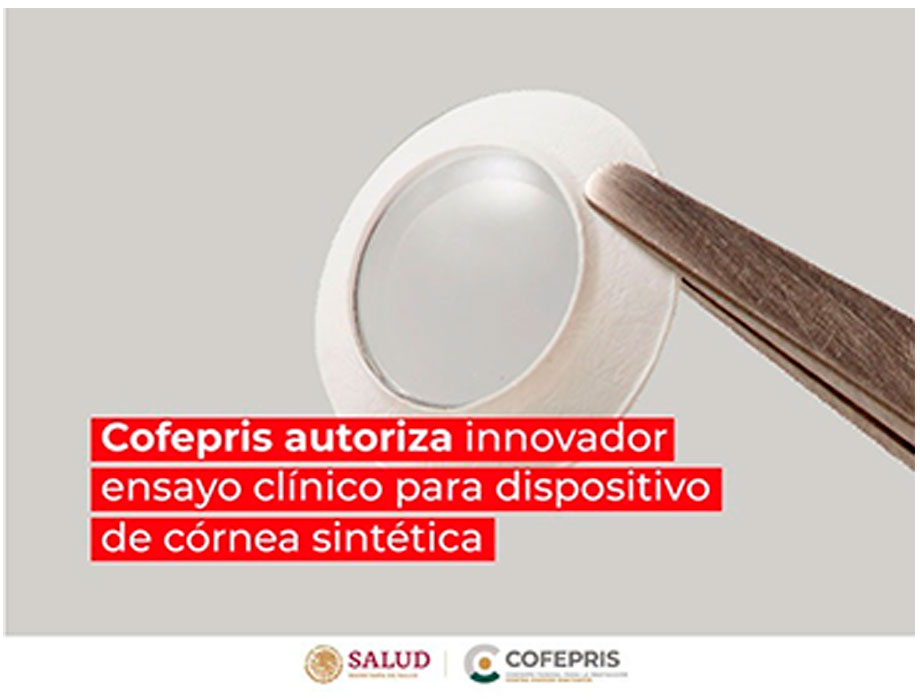 Comunicado. La Cofepris dio a conocer que autorizó un ensayo clínico innovador destinado a evaluar los resultados clínicos del dispositivo de córnea sintética GORE, en pacientes con pérdida de claridad corneal.