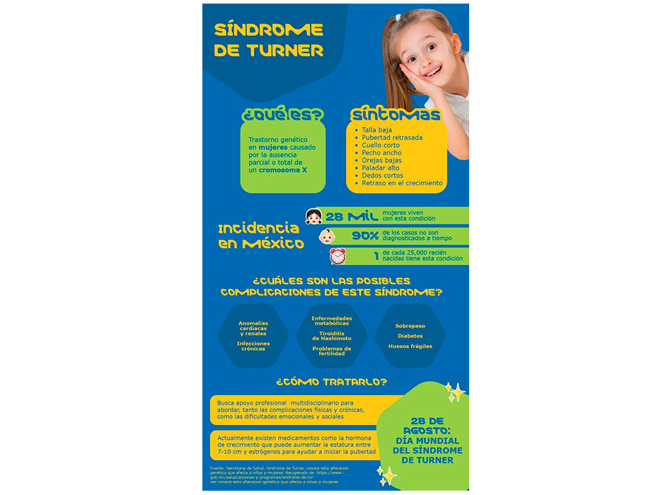 Comunicado. En el marco del Día Mundial del Síndrome de Turner, que se conmemora cada 28 de agosto, especialistas hacen un llamado a fortalecer la comprensión y el apoyo hacia las mujeres afectadas por esta condición, que, de acuerdo con la Secretaría de Salud, afecta a una de cada 2,500 recién nacidas en México, y se estima que alrededor de 28 mil mujeres viven con esta condición en todo el país.Sin embargo, a pesar de su incidencia, el 90% de los casos no son diagnosticados a tiempo.