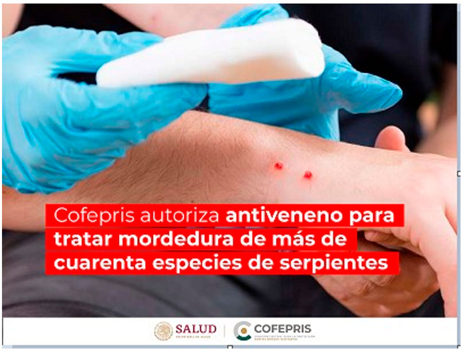 Comunicado. La Cofepris anunció que aprobó el registro sanitario de un antiveneno para tratar las mordeduras de determinados géneros de serpientes.